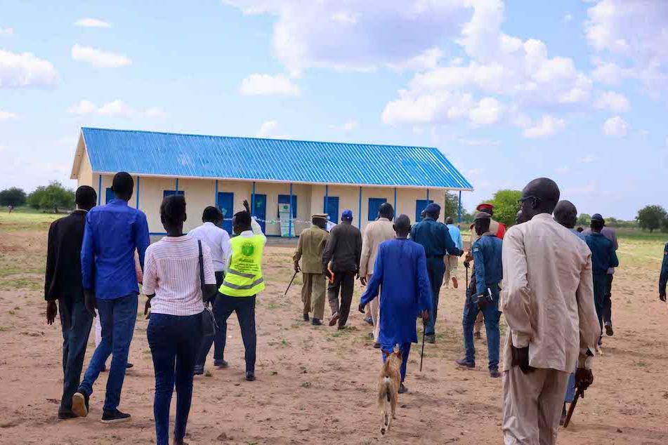 VIPs, and a dog, heading to inspect the new school in Gogrial West County as it is handed over by UNMISS. Photos: Zejin Yin/UNMISS
