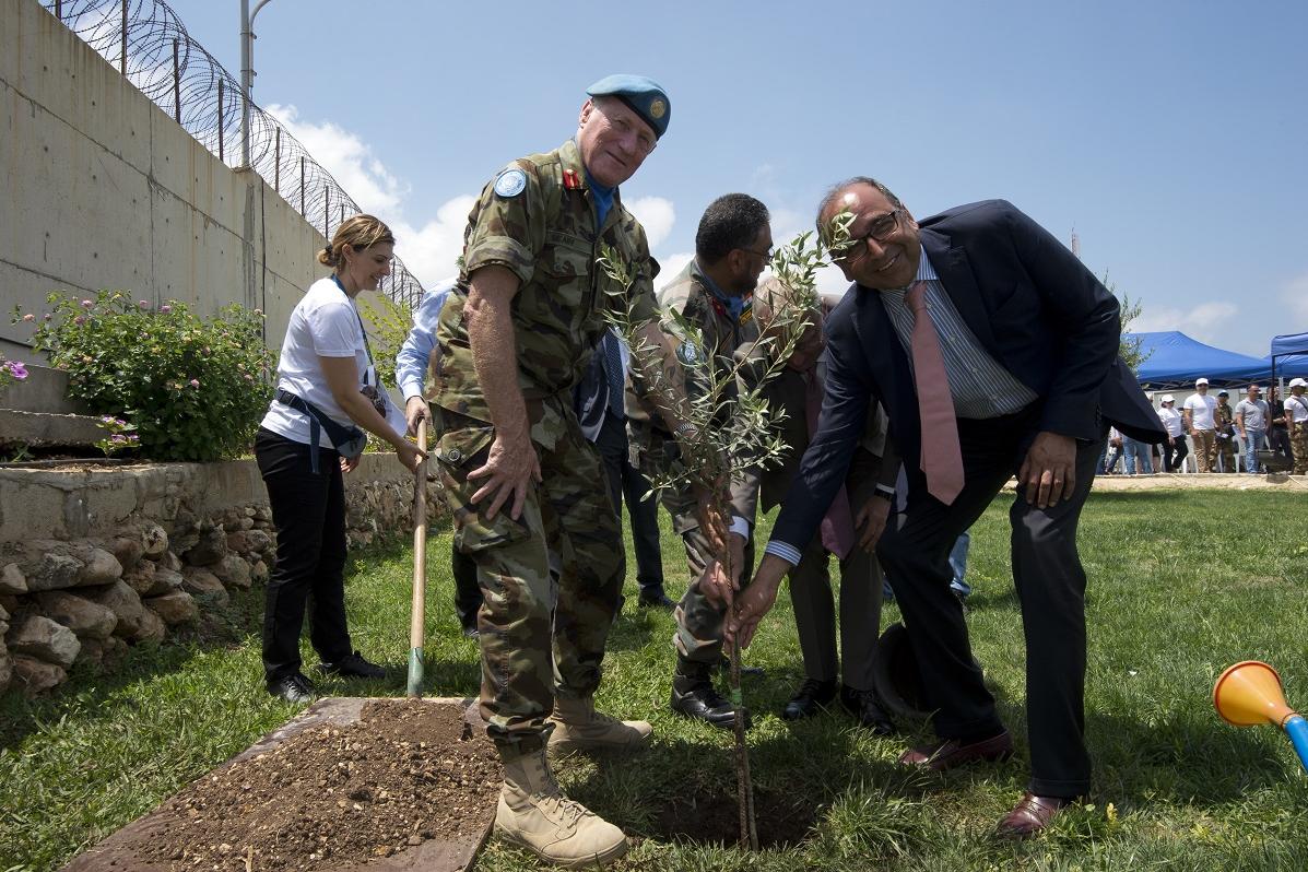UNIFIL Head of Mission and Force Commander, Major General Michael Beary, and UNIFIL Deputy Head of Mission, Mr. Imran Riza, plant an olive tree during the ceremony for 2017 World Environment Day in Naqoura. UNIFIL joined with…