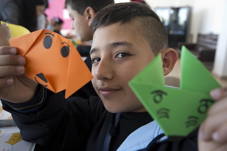 This student shows off his just finished origami cat and dog.