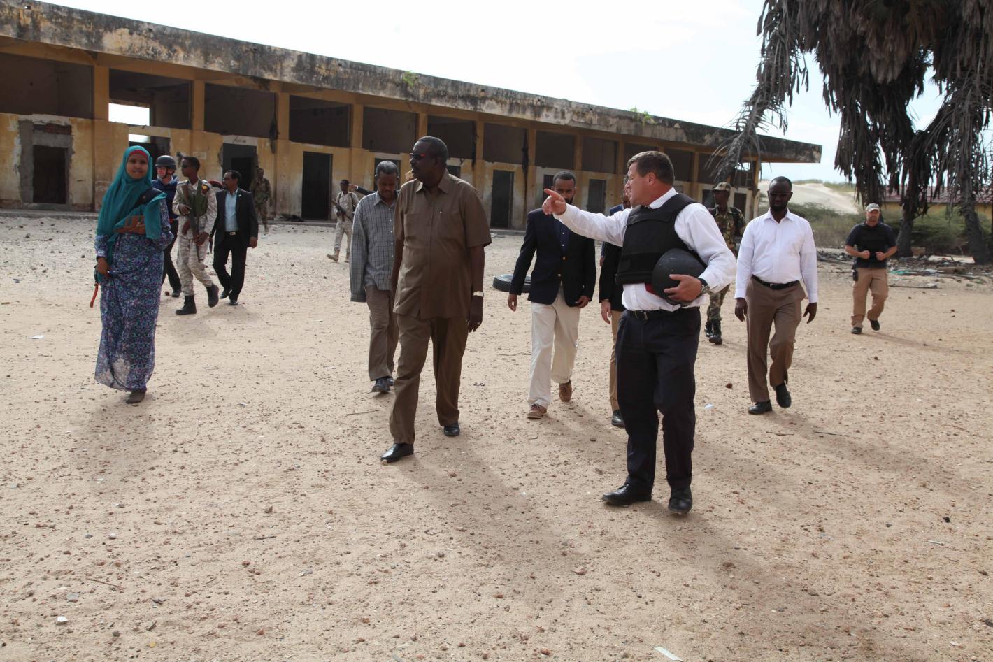 Patrick Loots, the Head of Disarmament, Demobilization and Reintegration from UNSOM, the Interim Jubba Administration Minister for Interior, Mohamed Warsame Darwish, and officials from the Germany embassy in Somalia at the site where the centre for disengaged combatants in Kismayo, Somalia will be built.