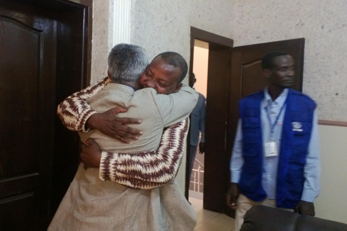 On 25 July, IOM staff member, Felix Ngoma, is received by UNAMID Head of Office in Nyala, Imtiaz Hussain, after he has been released. Photo by Saidi Msonda. Nyala, 25 July 2014 – A staff member with the International…