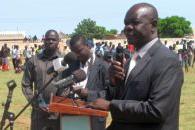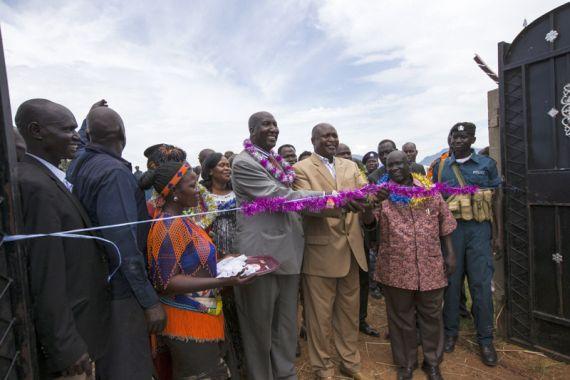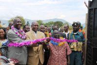 Eastern Equatoria State Governor Louis Lobong Lojore cutting ribbon of new health centre handed over along with school to Tirrangore community by UNMISS Disarmament, Demobilization and Reintegration (DDR) section and national…